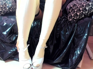 Busty amateur milf wears latex uniform and high heels