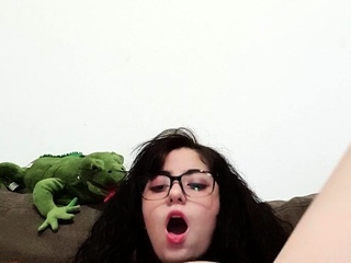 Busty curly brunette with big boobs fucks on couch